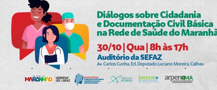 Na próxima quarta-feira, dia 30 de outubro, a Secretaria de Estado dos Direitos Humanos e Participação Popular e o Comitê Estadual de Erradicação do Sub-registro e Ampliação do Acesso à Documentação Básica, realizam o I Encontro “Diálogos sobre Cidadania e Documentação Civil Básica na Rede de Saúde do Maranhão”, das 9h às 17h, no auditório da Secretaria de Estado da Fazenda (SEFAZ) - Av. Prof. Carlos Cunha, s/n – Calhau.